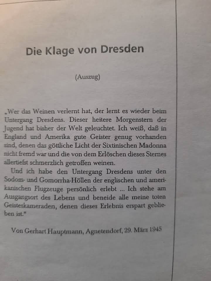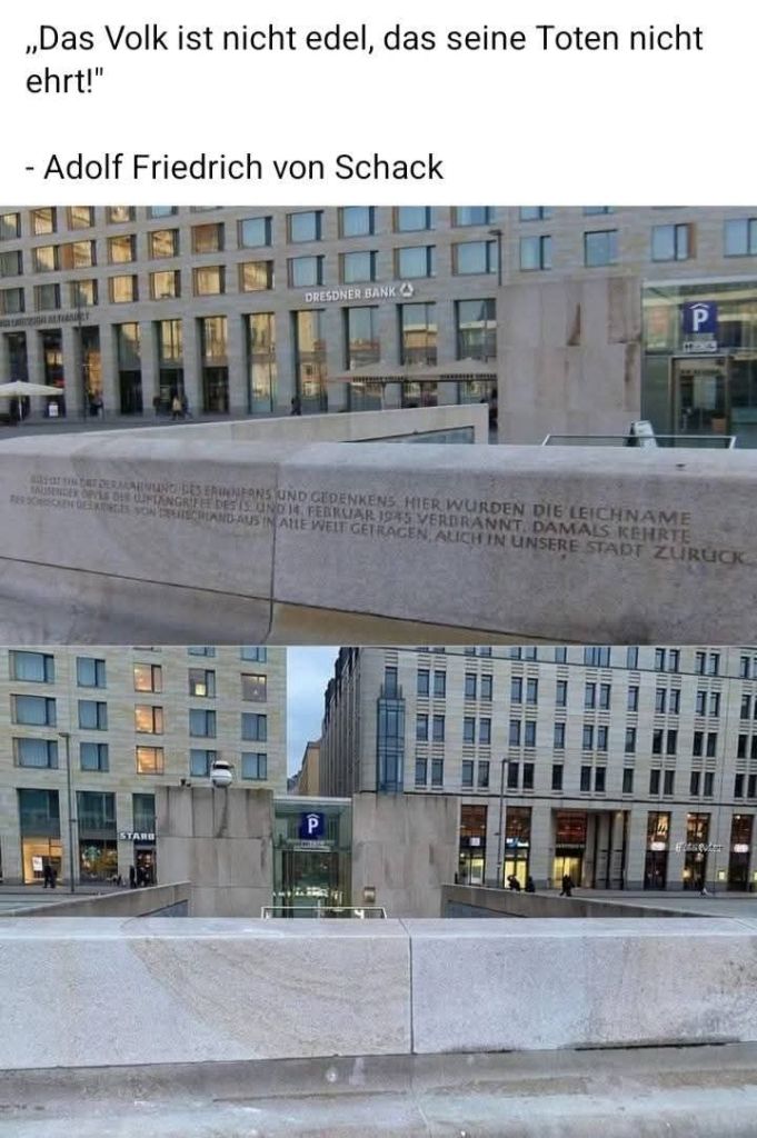 Am 15.01.2024 ließ dann die Stadt die Inschrift des Mahnmals für deutsche Bombenopfer entfernen. Aber nicht nur das. Nachdem man dann das Fehlverhalten eingestanden hat, gab es „großzügig“ eine NEUE Inschrift. Und die hat es in sich. Was für eine Verhöhnung, was für eine Billigung alliierter Verbrechen, was für eine große Lüge!