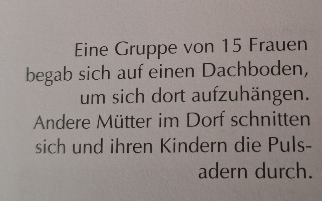 Es gab viele solche Verzweiflungstaten. Carmen ECKARDT berichtet von einer nahe gelegenen Stadt, in der eine Menschenmenge einfach gemeinsam ins Gaswerk ging und den Hahn aufdrehte.