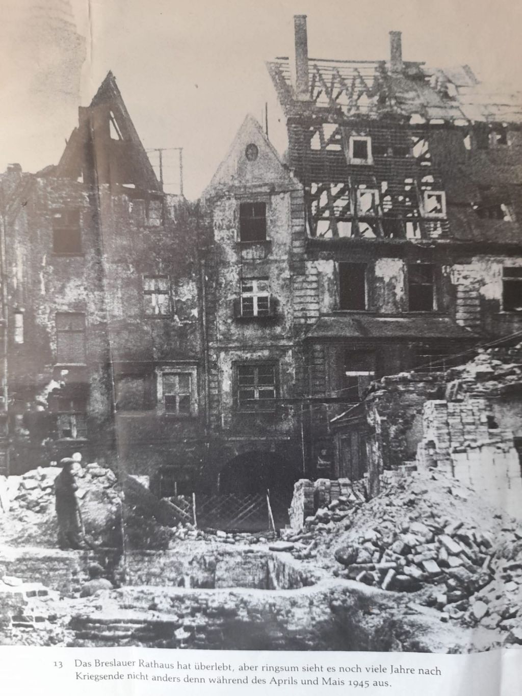 Als sich im Februar 1945 die Russen und ihre polnischen Hilfstruppen der schlesischen Hauptstadt näherten, wurde diese am 15.2. zur Festung erklärt (wie auch Glogau und Oppeln). Während der dreimonatigen Belagerungszeit kamen 40 000 Menschen vor Hunger und Kälte um. 70 Prozent der Stadt fielen dem Feuer der sowjetisch-polnischen Artillerie zum Opfer. Nachdem die Festung am 6. Mai (vier Tage nach Berlin) kapituliert hatten, richteten die Besatzer unter den Überlebenden ein Blutbad an. Die Polen, die am 9. Mai die Verwaltung Breslaus übernahmen, vertrieben die meisten der damals 200 000 deutschen Einwohner.