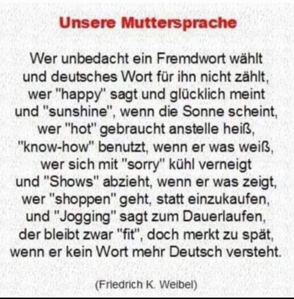 Wie sagt man so schön? Der Geist des deutschen Volkes bewährt sich am klarsten in seiner Sprache. Warum nur, spricht man in unserem Land dann so gern die „Sprache der anderen“ ?