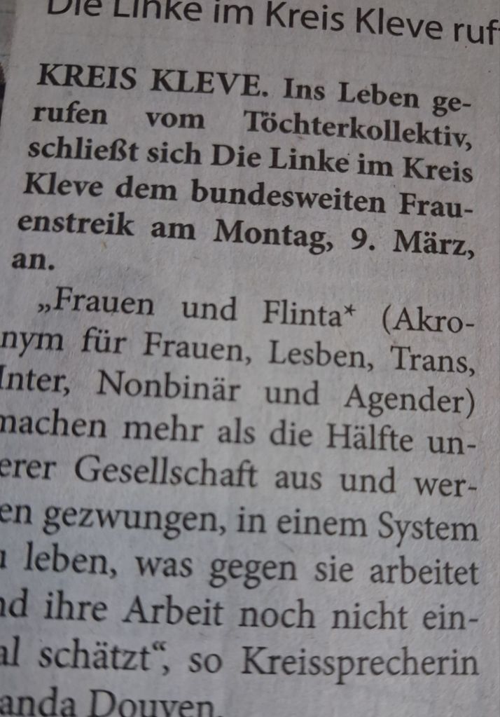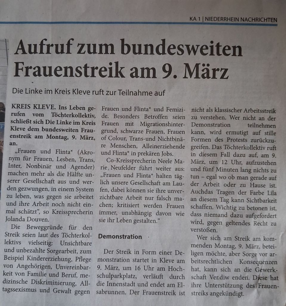 Ins Leben gerufen, von eben solchen Organisationen wie die unter einer Zetkin, wurde nun (März 2026) das „Töchterkollektiv“: Frauen und Flinta* (*Flinta steht für Frauen, Lesbe, Trans , Inter, Nonbinär und Agender). Dieses Töchterkollektiv ruft zur Teilnahme eines bundesweiten „Frauenstreiks“ am 9. März auf. (siehe Beitragsbild Zeitungsartikel)
