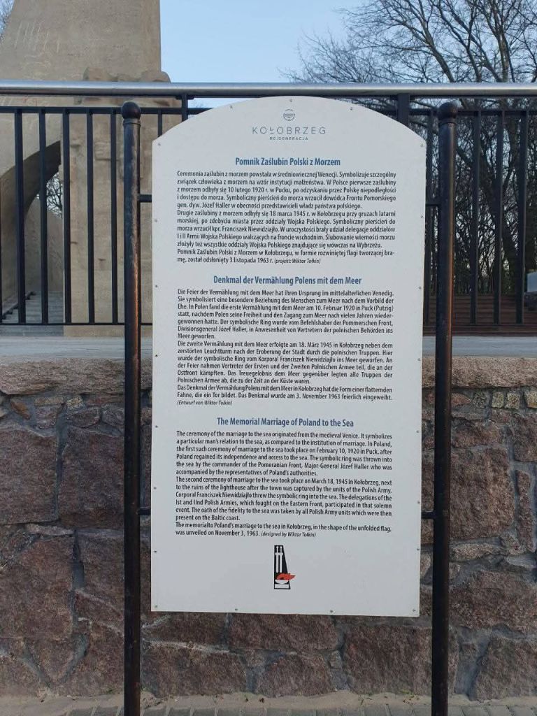 Zum Denkmal: „Nach der völkerrechtswidrigen Einnahme Kolbergs am 18. März 1945 fanden in der Nähe des heutigen Leuchtturms die Feierlichkeiten der Vermählung mit dem Meer statt, bei denen der Korporal Niewidziajło einen Ring in die Wellen als Zeichen der Zugehörigkeit der Ostsee zu Polen warf. Diese Zeremonie wird jedes Jahr an dem besagten Datum wiederholt, um daran zu erinnern, dass Polen den Zugang zum Meer wiedergewonnen hat. An das Ereignis erinnert das 1963 enthüllte Denkmal der Vermählung Polens mit dem Meer des polnischen Bildhauers Wiktor Tolkin (1922–2013).“