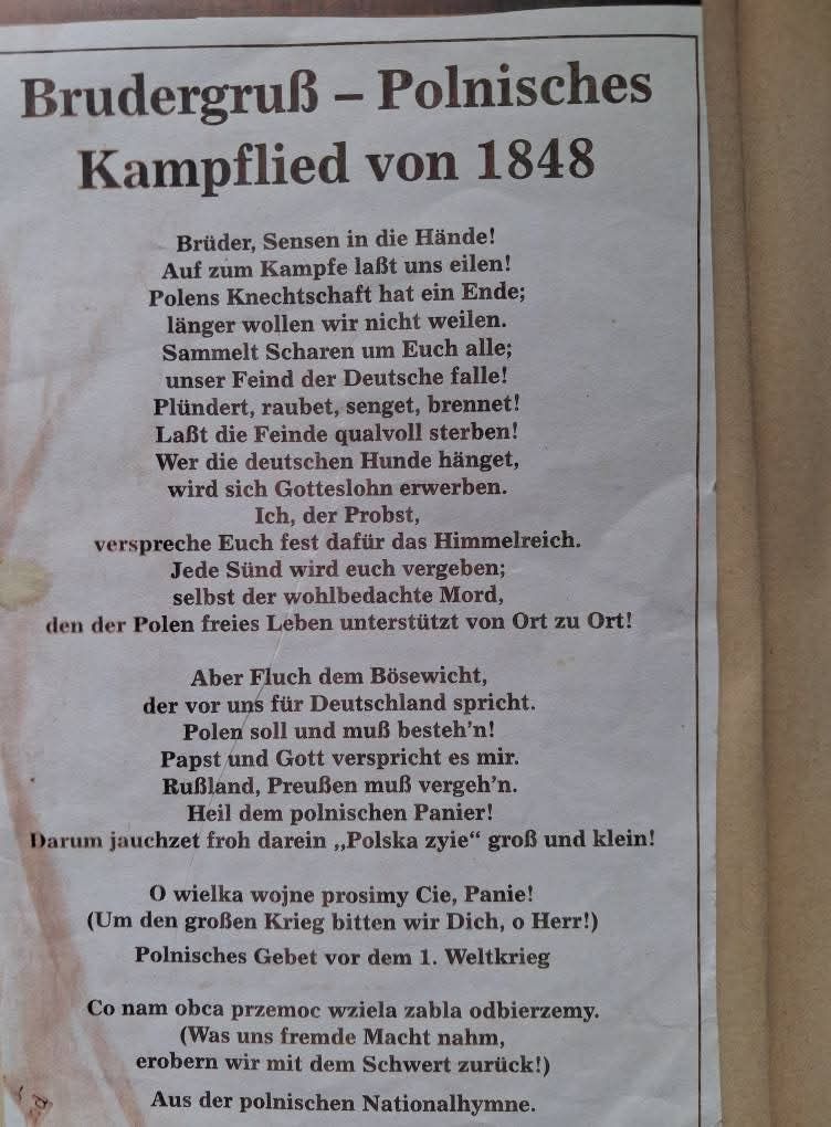 Dann fiel mir die polnische (ursprüngliche) Hymne in die Hände. Über meine zahlreichen Recherchen ist mir keine derartige Hetzschrift (Brudergruß- Polnisches Kampflied von 1848) unter allen Völkern dieser Erde wie diese der Polen untergekommen. Es lässt sich auch nach langem Suchen nichts dazu finden, das je ein Deutscher diese Art von Hymne, gefüllt von unermesslichem Hass gegenüber anderen Völkern verfasst hätte.