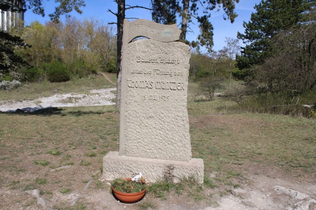 Wie eine Spirale windet sich die Blutrinne um den Berg. Die heutige Zufahrt werden die Landsknechte nicht genommen haben, als sie am 15. Mai 1525 mit Artillerie, Reiterei und Fußtruppen die Bauern von allen Seiten angreifen. Der Angriff kommt plötzlich und überraschend: ein Bruch des zuvor vereinbarten dreistündigen Waffenstillstandes. 8.000 aufständische Bauern stehen einem 6.000 Mann starken Heer gegenüber.