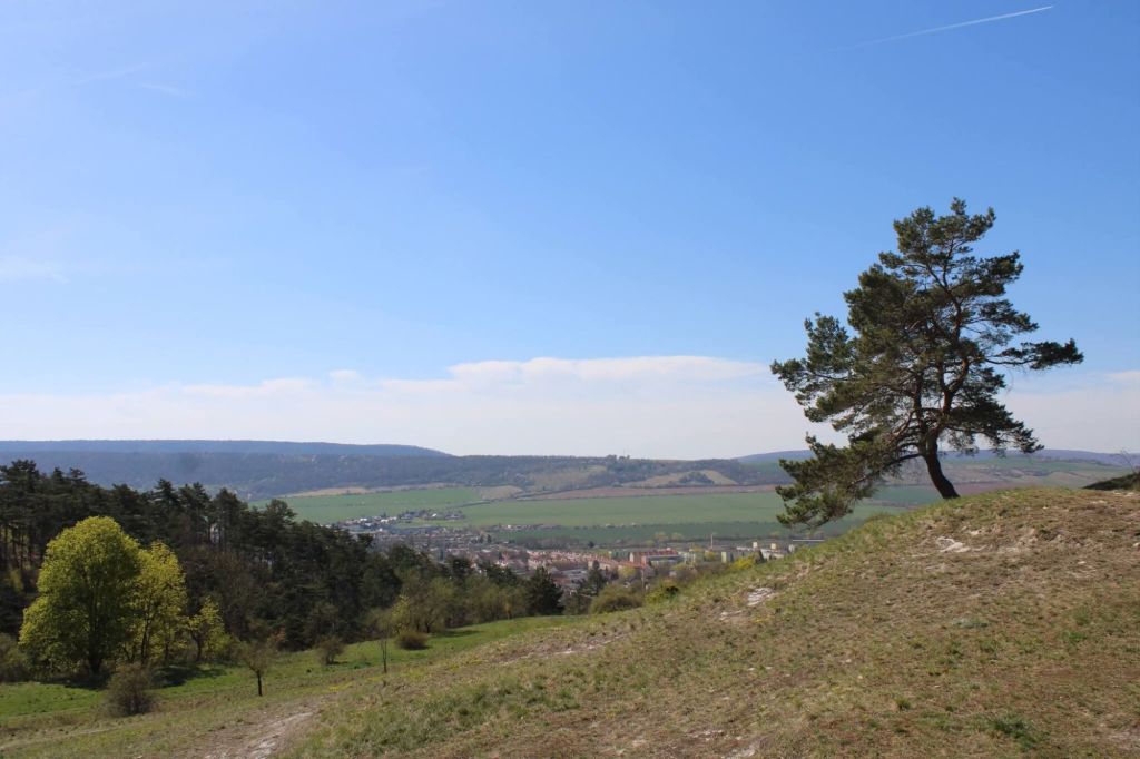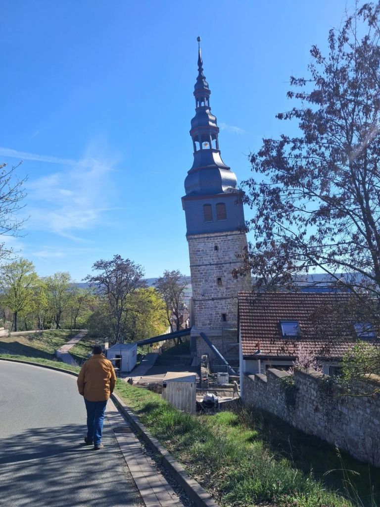 Über den Lutherweg (der zum Teil über die Blutrinne führt) geht es in den Ortskern. Am Fuß des Schlachtbergs liegt die Kirche, deren Turmspitze 4,60 Metern vom Lot abweicht. Damit hat der Turm eine größere Neigung als der schiefe Turm von Pisa. Grund für die Schieflage ist Wasser, das die Gips- und Salzschichten unter der Erde auswäscht. Dazu gibt es aber einen extra Beitrag.