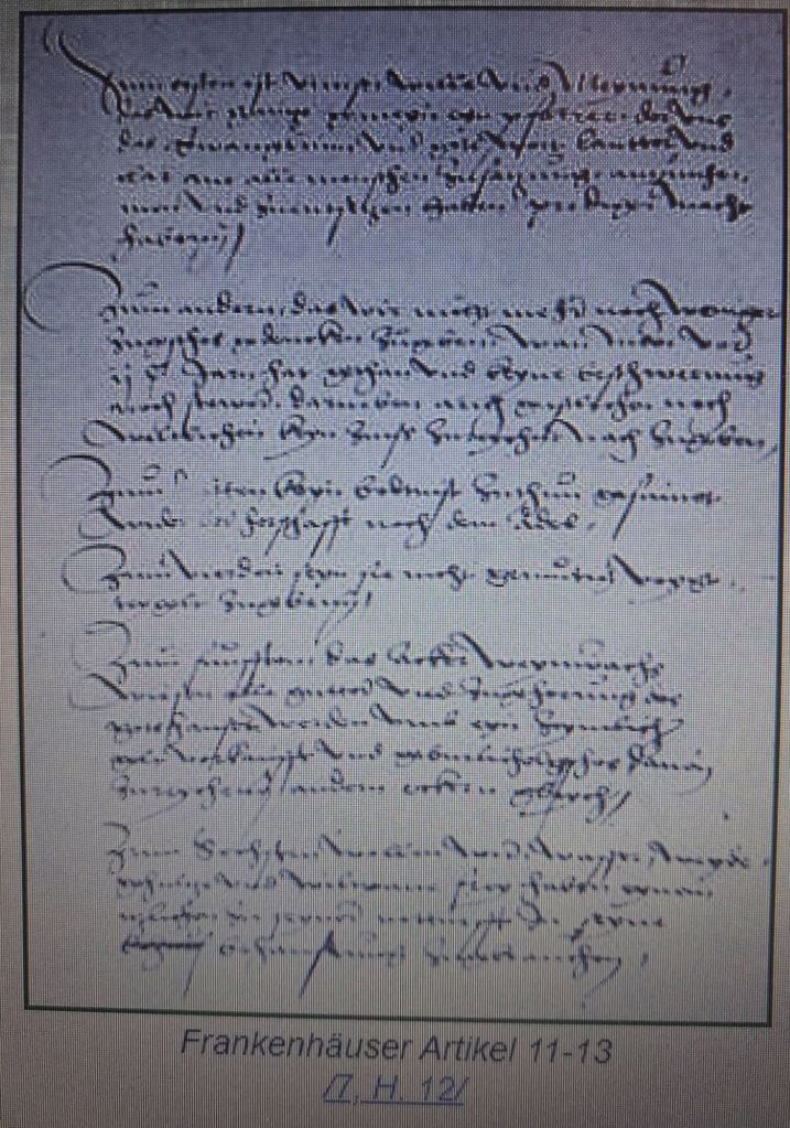 12. Das alle uswendig vor der stadt zu Franckenhusen wonen, wasser und weide mit den inwhonern gebrauchen, dem rate underworfen und schosbar sein und allen artikeln stadt und rat zu Franckenhusen gehorsam.