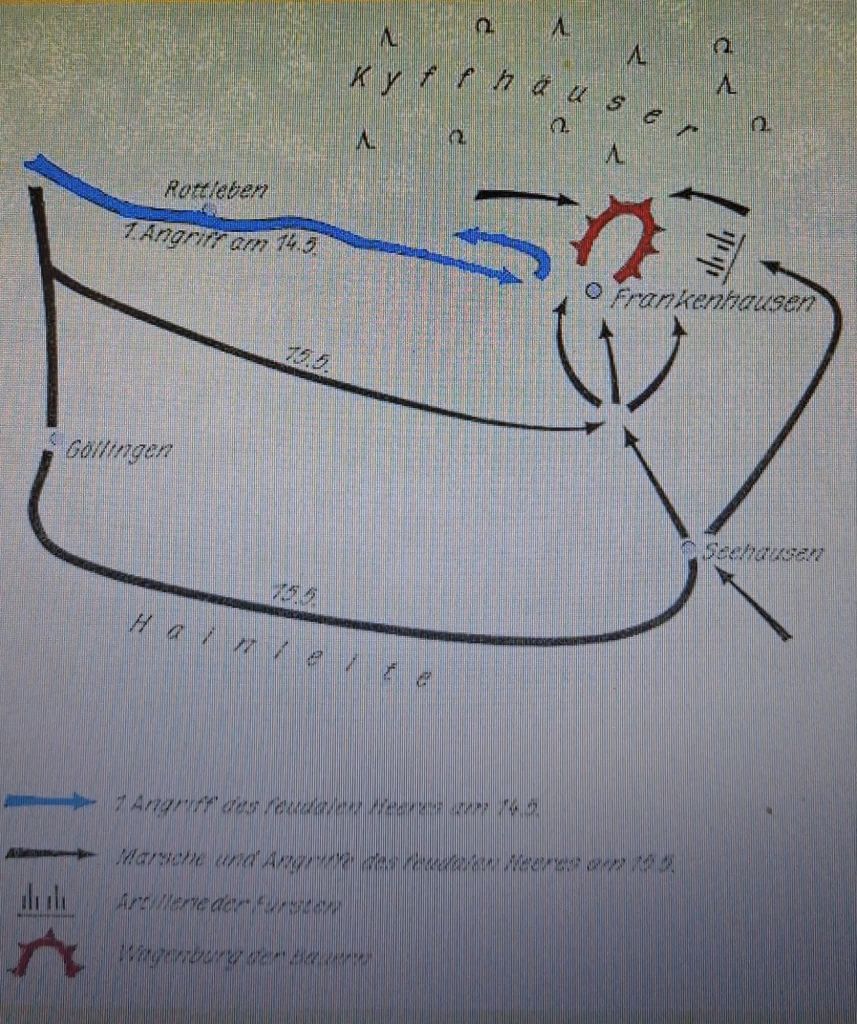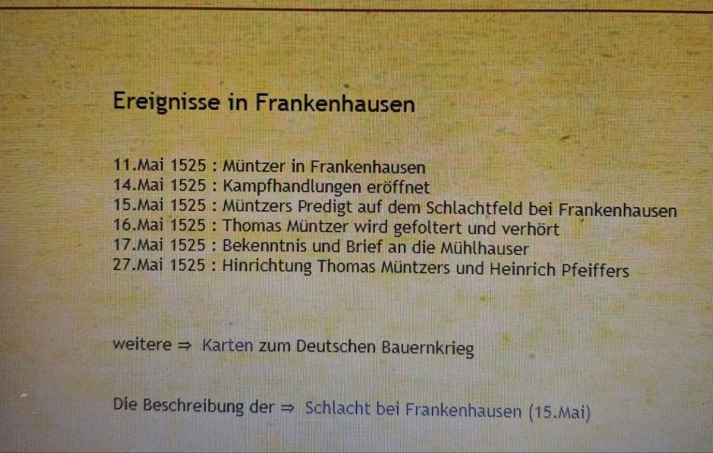 Die aufständischen Bauern unter Reformator Thomas Müntzer wurden durch ein Fürstenheer binnen einer Stunde vollständig besiegt. Etwa 5.000 Bauern fielen der Schlacht zum Opfer. Ihr Anführer Thomas Müntzer wurde gefangen genommen, gefoltert und schließlich in Mühlhausen hingerichtet.