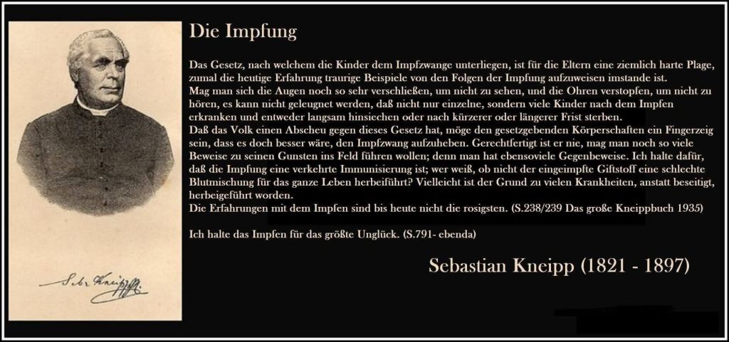 Pfarrer Kneipp über die Impfung: „Es düngt mich unwahrscheinlich, daß der Schöpfer wollte, wir sollten durch das Gift einer Kuh andere Gifte austreiben. Ich lebe auch heute noch der vollsten Überzeugung, daß das Impfen nicht notwendig wäre, wenn man guten Willens wäre. Auch ich war bei der Impfung – ich war damals 18 Jahre alt. Mir hat es gar übel bekommen. Ich mußte 14 Tage lang Unsägliches leiden und niederlegen durfte ich mich nicht. Mir hat es sonst nichts getan, nur recht weh hat es getan. Auch meine Schwester hat man geimpft. Wie ich große Blattern bekam und Geschwülste, so hat auch sie nach wenigen Wochen gefühlt, daß sie nicht mehr so gut sei; sie hat schauderhafte Zustände bekommen. Eine Bauerntochter, die acht Geschwister hatte und von recht gesunden Eltern abstammte, mußte auch geimpft werden, wenn sie nicht gestraft werden sollte. Schließlich kam sie in ein Narrenhaus, wo man sie einsperrte und fütterte, bis sie starb. Ein Landarzt versicherte mir, daß es bloß Folge des Impfens sei. Unglücklich diejenigen, wo die Natur nicht im Stande ist, dieses Gift auszustoßen. Diese dürfen sich auf eine lebenslange Krankheit gefaßt machen. Alte Leute behauteten mir damals, als so viele Krankheiten grassierten, solches hätten sie nie gesehen. Ich mußte daraus schließen, daß diese Zustände dem Impfen zuzuschreiben seien. Höret! Die Rehe und die Hirsche impft man auch nicht und die Kerls kommen ganz gut durch! Wäre ich Herr, ich würde das Gesetz abschaffen; aber ich bin leider kein Gesetzgeber.“
