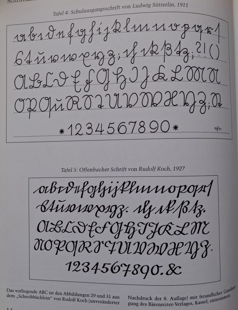 Übrigens: Ludwig Sütterlin (1865-1917), dessen Name oft fälschlich als Sammelbegriff für alle deutschen Schreibschriftarten verwendet wird, war der landläufig wohl bekannteste Erneuerer. Er stellte seine Buchstaben senkrecht, vereinfachte deren Form auf ein Mindestmaß und legte die Lineatur auf das Verhältnis 1 : 1 :1 fest. Seine Schulausgangsschrift, die mit einem Gleichzuggerät geschrieben wird, fand ab 1914 versuchsweise, ab 1924 verbindlich (Erlass U III A Nr. 138) in den preußischen Grundschulen Eingang und wurde bis 1930 bereits in den meisten deutschen Ländern im Unterricht verwendet (siehe Tafel 4 der Beitragsaufnahmen). Wenig bekannt ist, dass Sütterlin auch eine stilistisch entsprechende lateinische Schulschrift schuf.