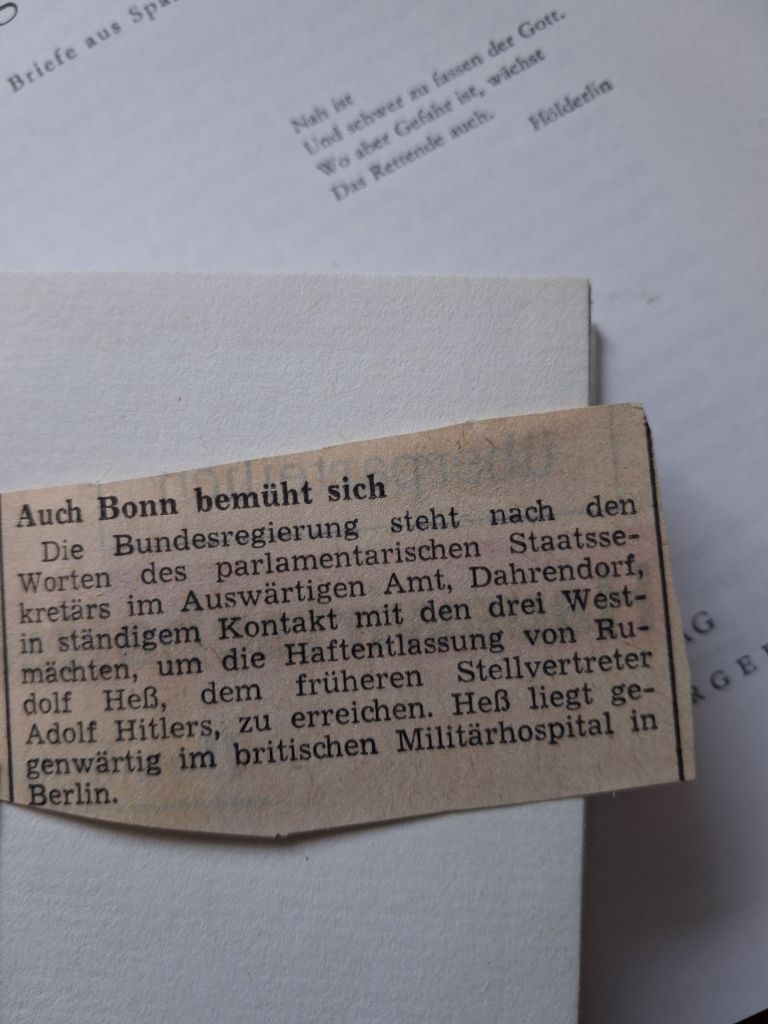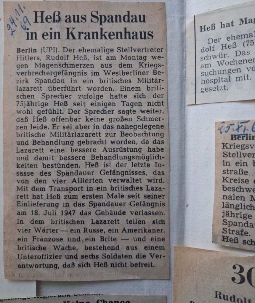 „Sein Tagesablauf ist bis auf die Minute genau geregelt. Um sieben Uhr wird Rudolf Hess geweckt. Er steht auf, macht seine Morgentoilette, frühstückt und liest. Nach dem Mittag wiederholt sich das Ganze: Lektüre, Spaziergang, Abendbrot. Um 22 Uhr wird ihm die Brille fortgenommen und das Licht ausgemacht. Nur wenn Hess es ausdrücklich wünscht, brennt die nackte Glühbirne etwas länger. So geht es Tag für Tag, Woche für Woche, Monat für Monat, jahraus, jahrein – seit 36 Jahren. Seit 36 Jahren sitzt Rudolf Hess in Spandau. Seit 18 Jahren befindet er sich in Einzelhaft. Im Keller steht ein Sarg. Das ist mehr, als irgendein Mensch in der neueren Geschichte jemals zu tragen hatte. – noch dazu ein Unschuldiger.“