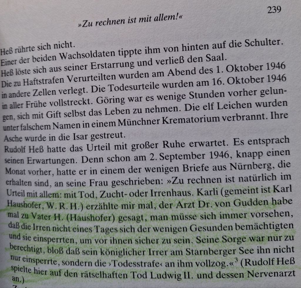 Selbst wenn HAUSHOFER suizidaleAbsichten gehegt hätte oder vielleicht sogar gerade, weil er sich mit diesen trug, hätte der von zwei Kriegen und den Schicksalsschlägen des Lebens geprägte Mann sicherlich noch einige Tage mit dem Selbstmord gewartet, um seinem Freund HESS, dem in Nürnberg die Todesstrafe drohte, als Entlastungszeuge mit seinem Wissen um die wahren Hintergründe und Motive des Englandfluges beizustehen.