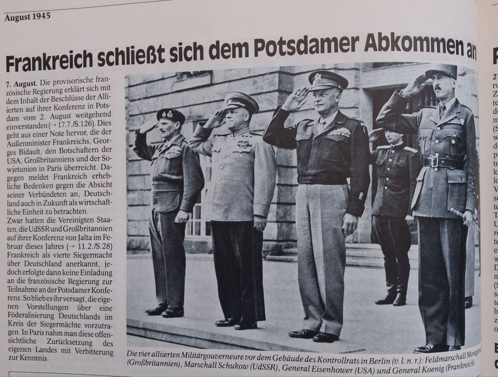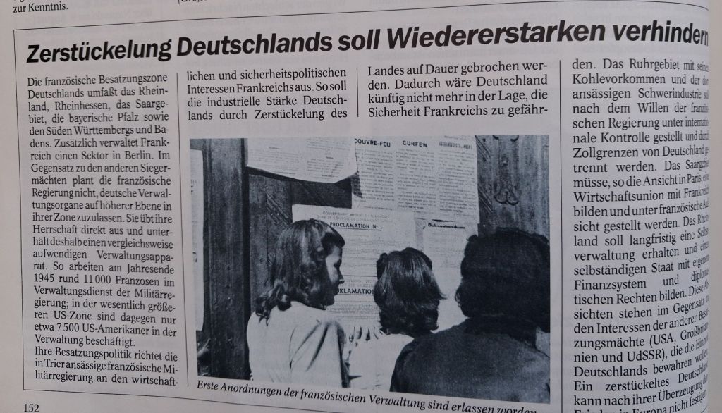 August 1945 zum „Ende“ des Folgekriegs: Frankreich, das Deutschland am 3. September 1939 den Krieg erklärt hatte, schließt sich dem Potsdamer Abkommen an. Frankreich besetzt das Rheinland, Rheinhessen, das Saargebiet, die bayerische Pfalz sowie den Süden Württembergs und Badens. Die französische Regierung übt ihre Herrschaft direkt aus und unterhält einen aufwendigen Verwaltungsapparat.
