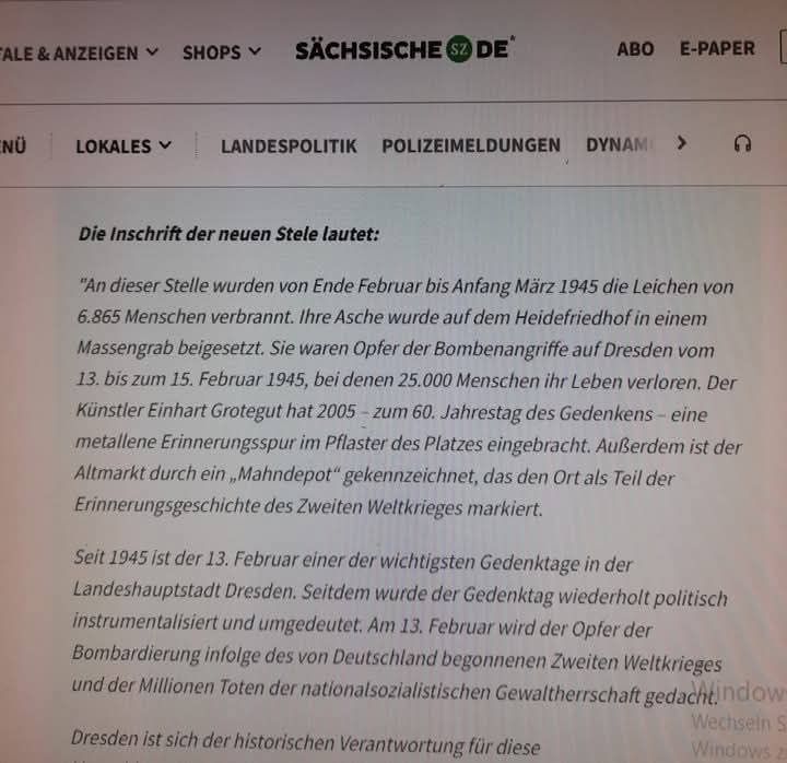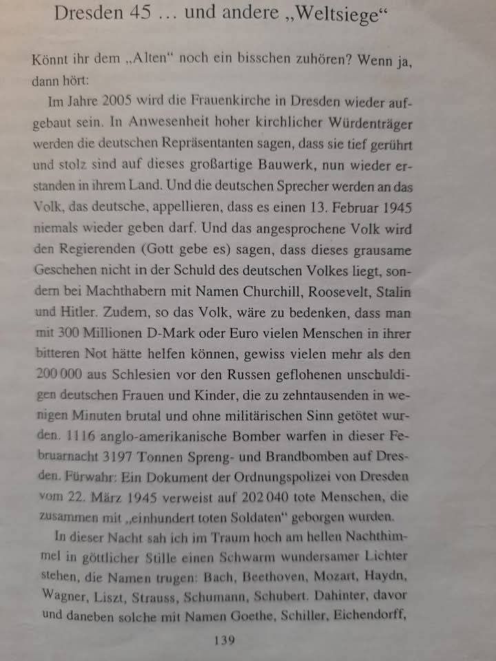 „Die staatlich geförderte, umfängliche Geschichtsfälschung ist Teil des Vernichtungskonzeptes gegen die deutsche Gesellschaft. Seit 25 Jahren wieder besonders gut zu erkennen!!“