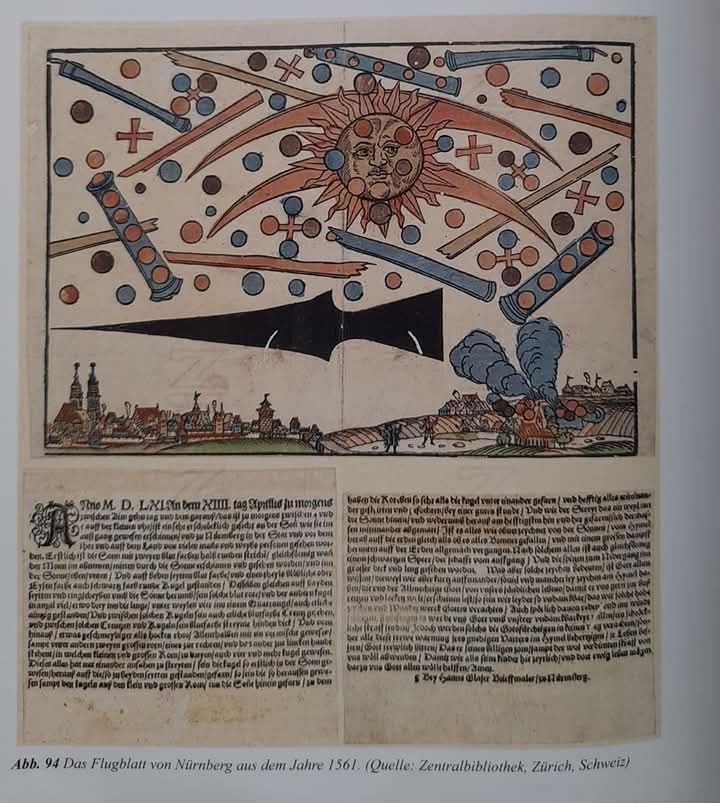 Es war die Zeit der Renaissance und Reformation, wo in einem christlichen Kontext Wundersames festgehalten wurde. Über Bildinhalte wurde bewusst immer eine Verbindung zur Religion und den christlichen Symbolen hergestellt. So waren oft Kreuze, Säulen, Krieger, Engel oder Gott selbst im Zusammenhang mit kugelförmigen Objekten zu sehen. Es konnte somit durch kirchlichen Einfluss in den dazugehörenden Erklärungen immer der „Allmächtige Gott“ als Urheber und Richter über die Menschheit leichter dargestellt werden. Das war notwendig, um in der Bevölkerung ein schlechtes Gewissen, also Schuldgefühle, hervorzurufen und dauerhaft bis heute zu verankern.