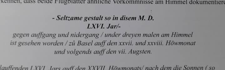 Heute wissen nur wenige Eingeweihte der Kirche und des Adels darüber Bescheid. Es werden in der Transkription zwei genaue Daten genannt, die auf den 14. Grasmond (April) 1561 in Nürnberg und auf den 27. Heumond (Juli) 1566 in Basel hinweisen. In der Nürnberger Stadtchronik vom 14. April 1561 wird als ausschlaggebender Grund für das Ereignis ein Gegenstand erwähnt, der im selben Jahre kurz davor in einer unterirdischen Anlage verrückt oder verschoben worden ist. In dieser Zeit / um die Mitte des 16. Jahrhunderts wird von mehreren Ereignissen am Himmel berichtet, die für die damalige Bevölkerung mehr als mysteriös erscheinen mussten. Diese wurden von vielen Tausend Menschen an mehreren Orten in Europa und verschiedenen Ländern der Welt über Jahrzehnte hinweg gesehen.