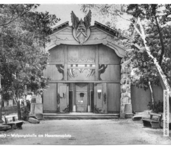 • Die 1901 eingeweihte und im altgermanischen Stil errichtete Walpurgishalle steht unweit der Bergstation der Seilbahn. Über dem Eingang ist der Kopf des Gottes Odin (Wotan) angebracht. Er opferte ein Auge, um aus dem Brunnen der Weisheit zu trinken und dann in die Zukunft zu sehen. Fünf große Gemälde zeigen Szenen aus der Walpurgisnacht nach Goethes „Faust“. Im Eingangsbereich steht ein uralter Opferstein aus Granit. Dieser altheilige Stein mit einer eingemeißelten Svastika, dem glücksverheißenden Sonnensymbol, wurde 1901 mit einer Bronzeaxt unweit von hier entdeckt.