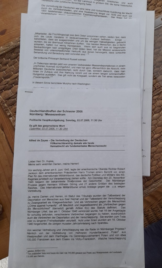 Meine Mutter traf Herrn de Zayas persönlich auf dem Schlesiertreffen in Nürnberg zur politischen Hauptkundgebung am 3. Juli 2005. Dort sprach er eindrucksvoll über die völkerrechtswidrige Vertreibung der Deutschen.