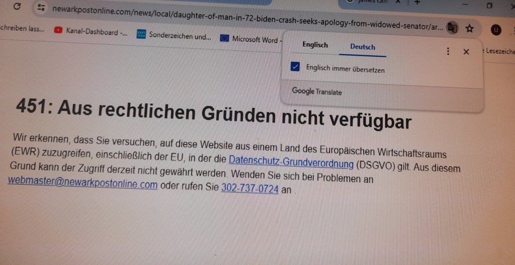 Ich wollte noch ein bisschen mehr darüber erfahren, aber manche Seiten ließen sich leider nicht öffnen (aus rechtlichen Gründen nicht verfügbar): „Hamilton, Carl (30. Oktober 2008). „Tochter des Mannes, der 1972 in den Biden-Unfall verwickelt war, bittet verwitweten Senator um Entschuldigung“ . Newark Post . Archiviert am 4. Februar 2021 in der Wayback Machine“…