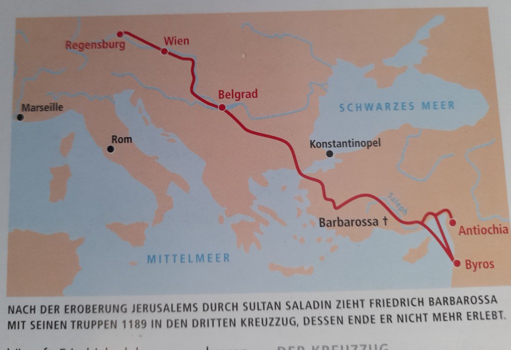 Da kam die Kunde, dass Jerusalem in die Hand der Ungläubigen gefallen sei. Der fromme Kaiser beschloss, sein ruhmreiches Leben durch das Gott wohlgefällige Unternehmen eines Kreuzzuges zu krönen. Nach großen Erfolgen fand er in Kleinasien, im Fluss Saleph, im Sommer 1190 einen plötzlichen Tod, als er sich der Hitze und dem Staub des Tages durch ein Bad in dem kalten Gebirgswasser erfrischen wollte.