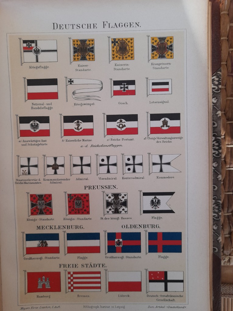 Die Bilder, die ihr hier seht, oder besser die kleine Flaggenkunde stammt aus Meyers Konversationslexikon aus dem Jahr 1894 /Vierter Band.