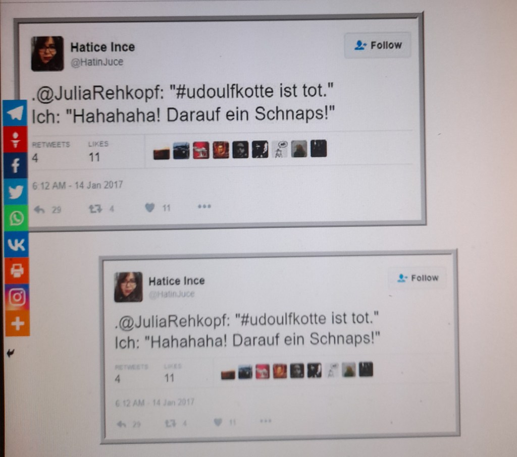 Beginnen wir doch mit einer Aussage der Spiegel-Journalistin Hatice Ince, die völlig unverhohlen ihre Freude über den plötzlichen Tod des 56-jährigen Udo Ulfkotte am 14. Januar 2017 kundtut. Sie lacht offen über den Tod und möchte darauf anstoßen