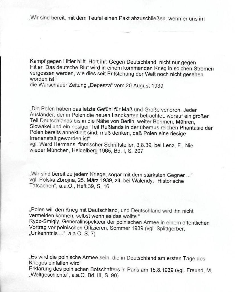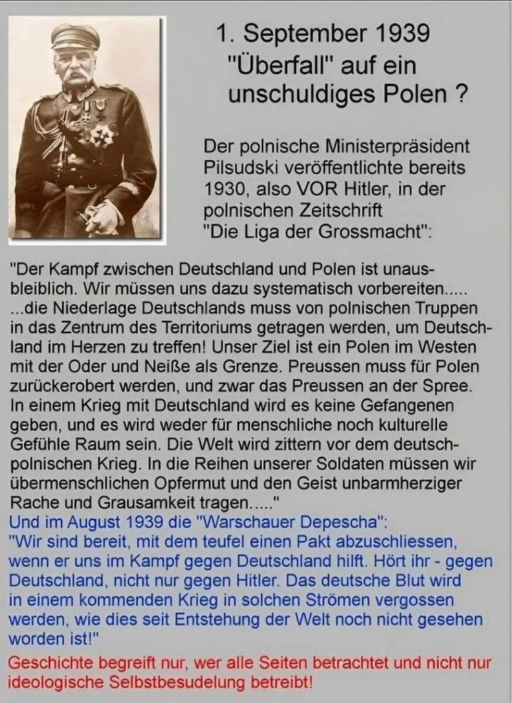 Es wird Zeit, das die Geschichte neu geschrieben wird – ohne Zutun der Sieger. Polen spielt, wie so oft, ein dreckiges Spiel. Der Landraub und die Großmachtphantasien der Oberen Zehntausend Irren in Polen werden nirgendwo beschrieben. Wer redet von Bluttaten von Bromberg etc. vor dem WK II, Hunderten zu Tode geknüppelten Deutschen? Meine Mutte und Ihre Familie haben 1947 innerhalb von 12 Stunden, nur mit dem Nötigsten, ihre Heimat in Kanterdorf / Brieg Niederschlesien verlassen müssen. Sie haben einen großen Landbesitz mit funktionierendem landwirtschaftlichen Betrieb, Flachsanbau, Weberei, Imkerei und was noch alles, den Polen überlassen. Und heute: 90 % der Felder sind seit 1947 unbewirtschaftet, die große Allee mit 200 jährigen Eichen ist abgeholzt, der Dachstuhl aller Gebäude verheizt, die Gebäude verfallen., So ging es Abertausenden von Deutschen. Der ideelle Wert unbezahlbar. Der Geldwert ungeheuer. Meine Großmutter und meine Mutter haben erst kurz vor ihrem Tod erzählt, wie die Polen gehaust haben nach Kriegsende, Sogar russische Soldaten haben sich schützend vor sie gestellt (Sie hatten Gottseidank einen Offizier mit Charakter.) Das Maß ist voll. Ich war und bin nicht gewillt, mein Volk als ein Volk von Verbrechern, Revanchisten und dumpfen Mördern bezeichnen zu lassen von denen, die eben dieses sind, was sie versuchen, uns anzuhaften. Unser Volk wurde immer beneidet, aber auch bewundert. Sie wollten so sein, wie wir, waren aber selten dazu in der Lage, noch bereit, diese, unsere Anstrengungen zu vollbringen.