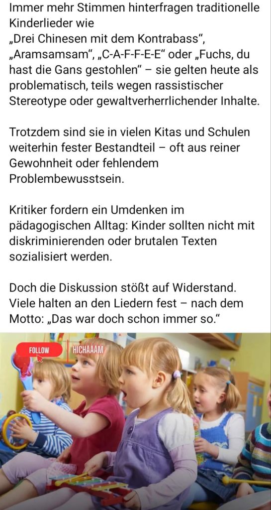 Und sie faseln vor sich hin, völlig verrannt ohne Sinn und Verstand: So machte eine Michelle Kröger im Jahr 2023 die folgende Feststellung: Kommen wir nun zu den „schlimmen Kinderliederklassikern“ . Wow! Es gibt so viele Kinderlieder, die eigentlich verboten gehören. In unserer Kindheit haben wir sie wahrscheinlich alle noch fröhlich mitgeträllert – aber muss das heute noch sein? Sollten wir unsere Kids wirklich diese Liedtexte singen und hören lassen? „