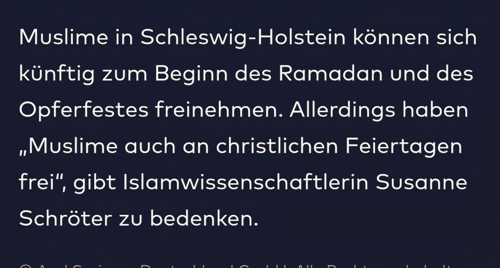 Meine Gedanken zu oben gegannten Fall: Ich finde es schön und wichtig, dass man Muslimen erlaubt, ihre Feiertage mit der Familie zu verbringen. Nun könnte man natürlich sagen, dann wäre es auch gerecht, dass Muslime an Weichnachten und Ostern arbeiten. Sehe ich auch so. Es ist aber nur so, dass an christlichen Feiertagen alle Geschäfte, Unternehmen, Läden, Firmen zu haben. Wie soll der Muslim dann arbeiten? Wenn man an christlichen Feiertagen die Läden öffnen würde, würde es unter Umständen empört heißen: „Jetzt müssen auch noch an Feiertagen die Geschäfte wegen den Muslimen aufhaben.“