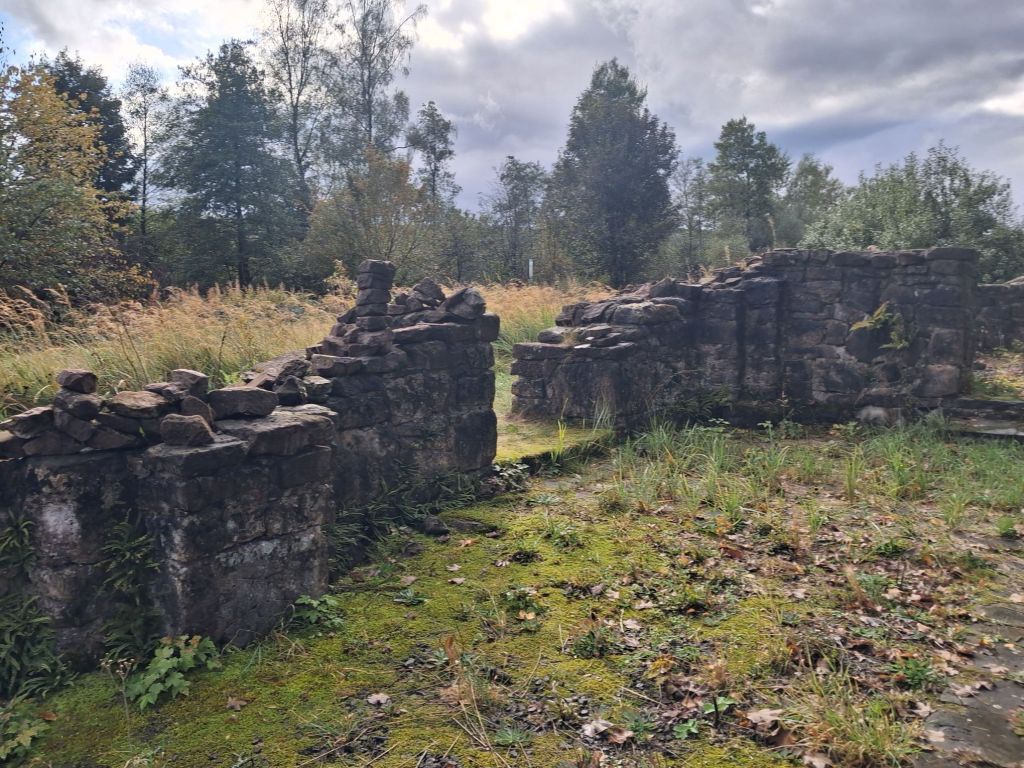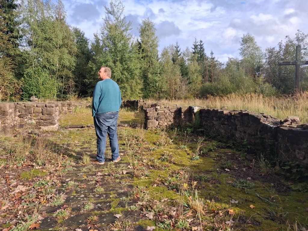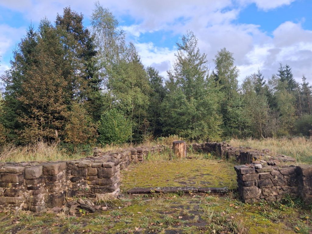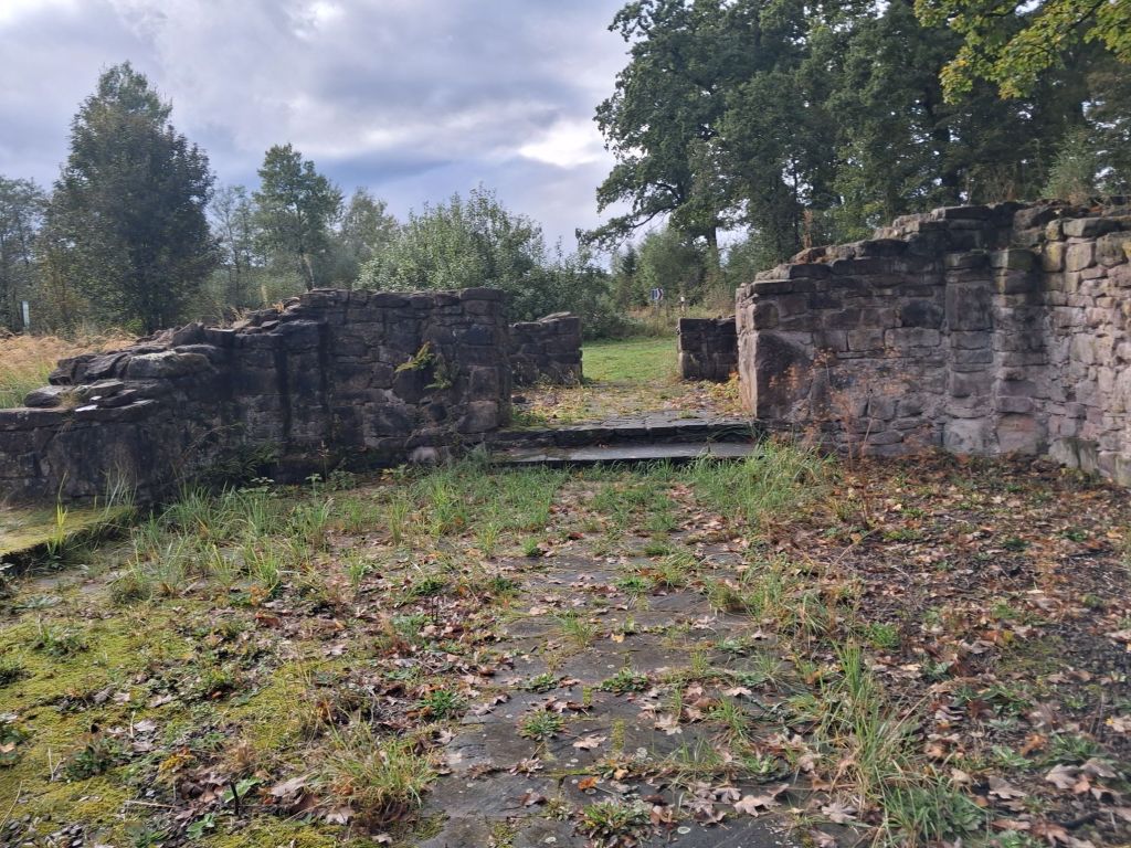 In den vergangenen Jahren sind wir immer wieder an dieser Ruine vorbeigekommen, aber weil sich nirgendwo ein Platz zum Parken gefunden hat, sind wir weiter gefahren. Nur dieses Mal wollten wir es endlich genauer wissen, was es mit dieser Ruine auf sich hat. Wir entdeckten einen Wanderparkplatz „zum Hutewald“ und dachten, na vielleicht gelangen wir von da aus zu dieser Ruine. Fehlanzeige. Kein Weg führte dorthin. Also waren wir mal frech und parkten am Straßenrand. Einige Meter mussten wir nun auf der stark befahrenen Straße entlang laufen.