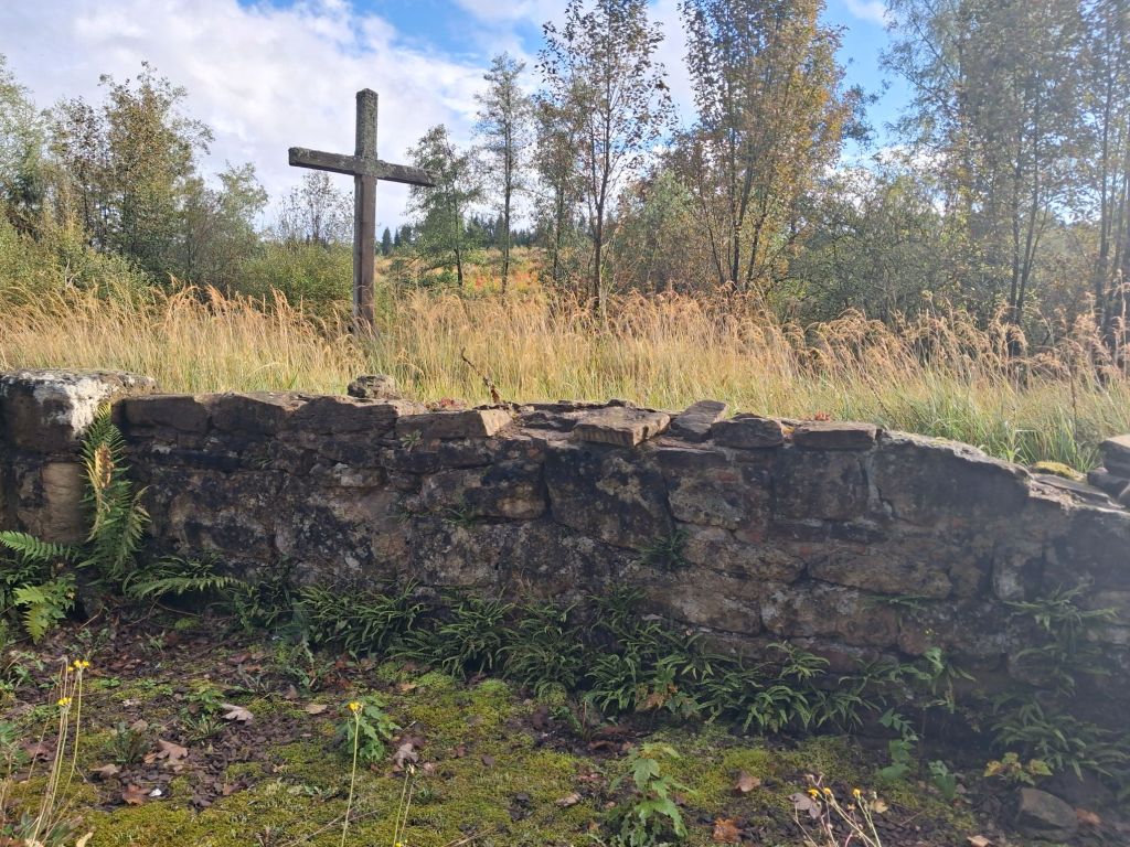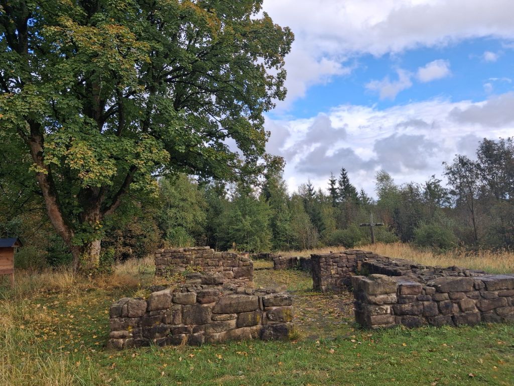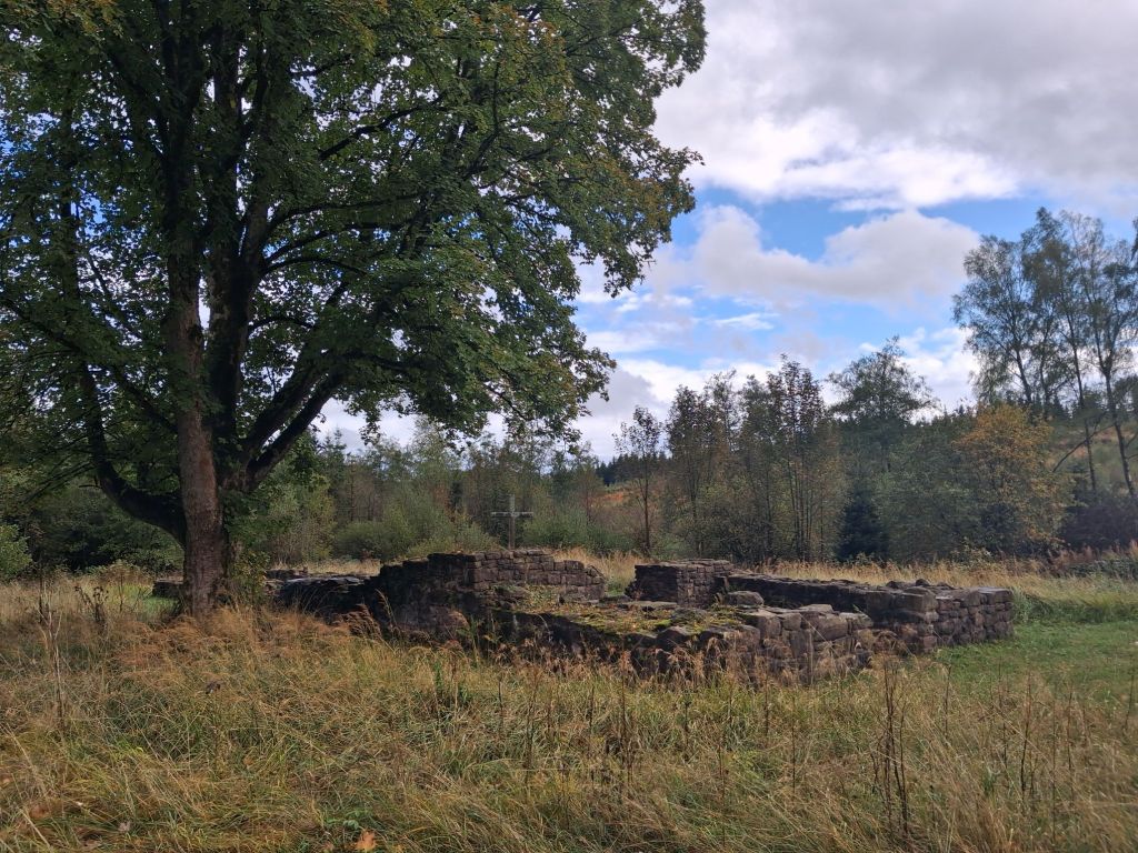 Wir halten also fest: Zunächst muss man lange suchen, um an genauere Informationen über die Ruine zu gelangen. Am Ort selbst findet sich keine Erläuterung . Zwar steht dort eine Tafel, aber darauf lässt sich nichts finden. Auffällig ist das Kreuz, welches unmittelbar an der Ruine platziert wurde. Dass ist nicht ungewöhnlich. Denn es ist ja bekannt, dass die Kirche sich überall dort mit ihren „Symbolen“ verewigt hat, wo einst die Heiden ihre Quellen und Opferplätze bewahrten.