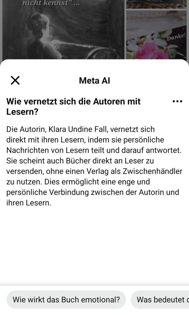 Einige weitere Erläuterungen der KI zu meinem Buch füge ich als Fotos /Screenshots bei. Und ja, sie trifft es ihrem „Vermögen“ nach vielleicht ganz gut.