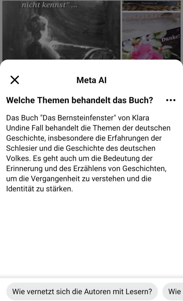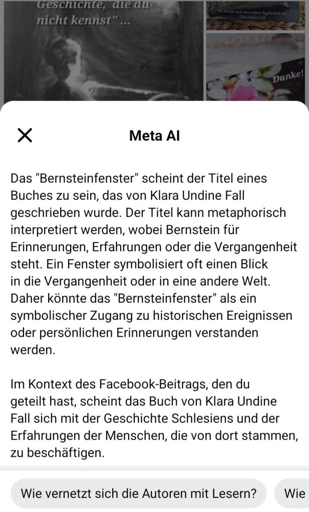 Dort hieß es, was den Inhalt meines Buches das „Bernsteinfenster“ betrifft: „Der Titel symbolisiert wahrscheinlich eine Verbindung zur Vergangenheit und Geschichte, insbesondere im Kontext von Schlesien, da Bernstein oft mit der Region assoziierte wird. …“