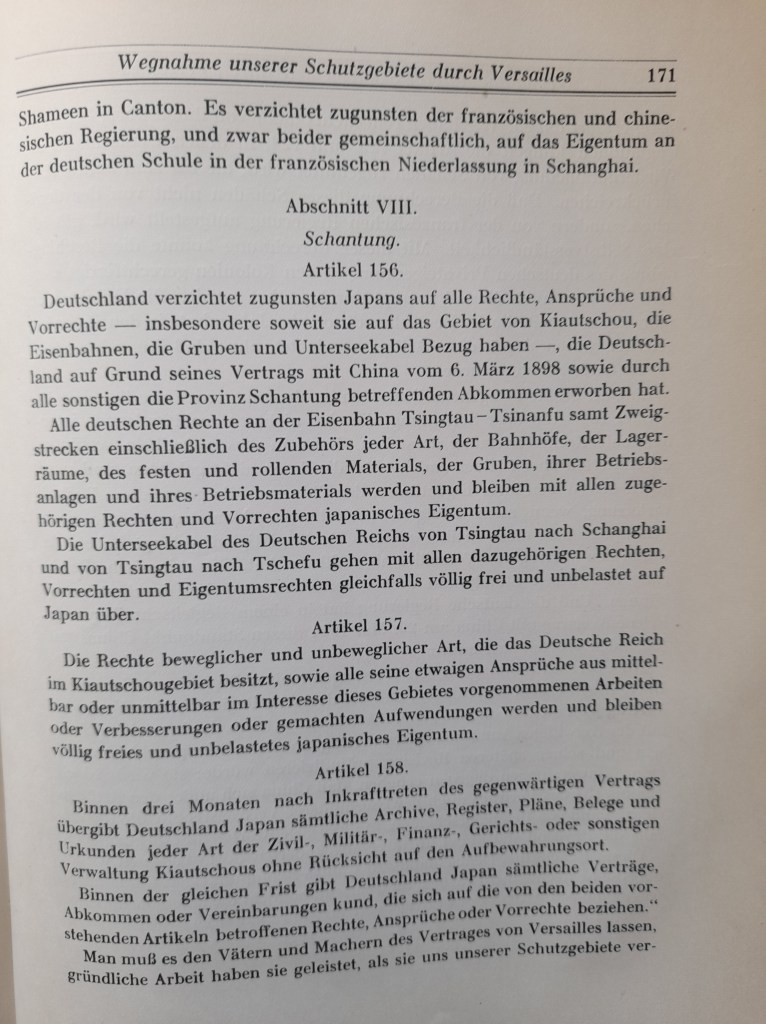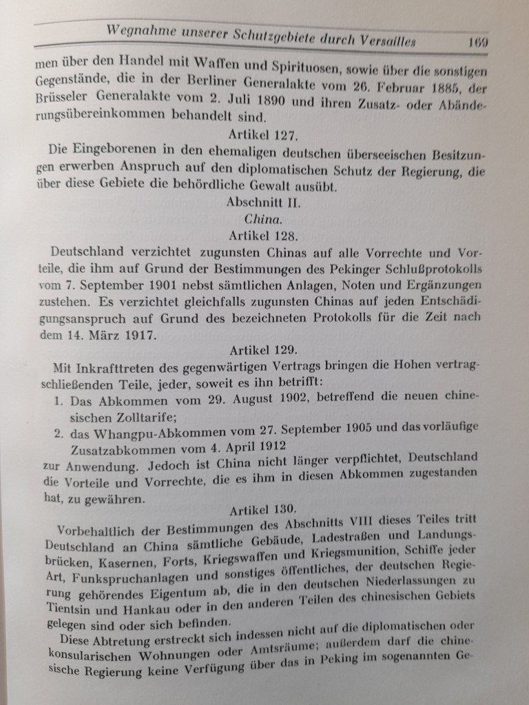 Auch die anderen Kolonien teilten die großen Sieger untereinander auf. Das waren in China: Kiautschou, in der Südsee Neuguinea, Samoa, die Marschall-Inseln, Palau u. einige kleine Inseln.