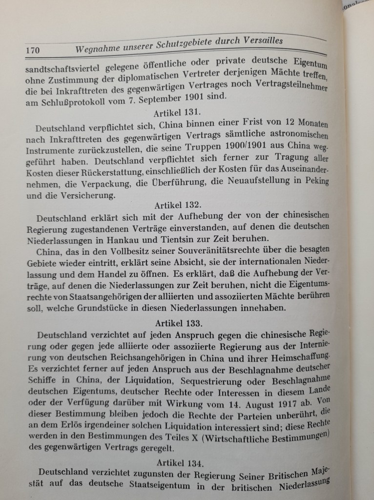 Zu der riesenhaften Kriegsbeute zählten auch die Kolonien in Afrika, (die Franzosen, Engländer u. Belgier besetzten bereits 1916 Deutsch-Südwest (heute Namibia), Ostafrika (heute Teil von Tansania), Kamerun u. Togo. Belgien, England und Frankreich teilten sich die Gebiete, enteigneten und vertrieben die Deutschen, nahmen deren Häuser und die angelegten Plantagen, Bahnanlagen und vieles mehr in Besitz.