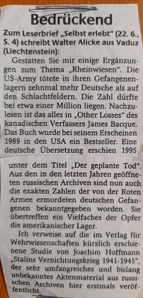 Eigentlich wollte ich heute einen Beitrag zu dem Massaker von Aussig erstellen. Ebenfalls nicht fertiggestellt sind die Beiträge zum Lager auf den Rheinwiesen. Wir erinnern uns. Diese Lager, Wiesen, Äcker, nackter Boden, aufgeweicht vom Regen, keinen sanitären Anlagen, keine Zelte, keine medizinische Versorgung der verwundeten Soldaten – gemäß der SHAF-Botschaft, die Eisenhower an Marshall richtete, worin es heißt, dass die neuen Kriegsgefangenen kein Anspruch noch irgendeinen Komfort zu beanspruchen haben.