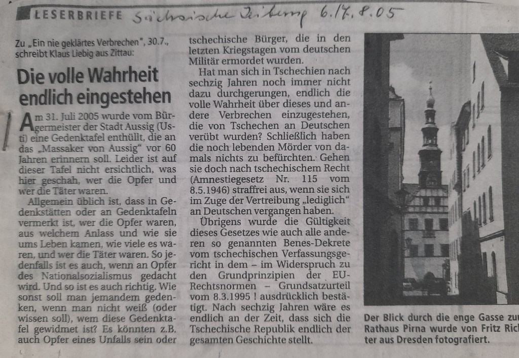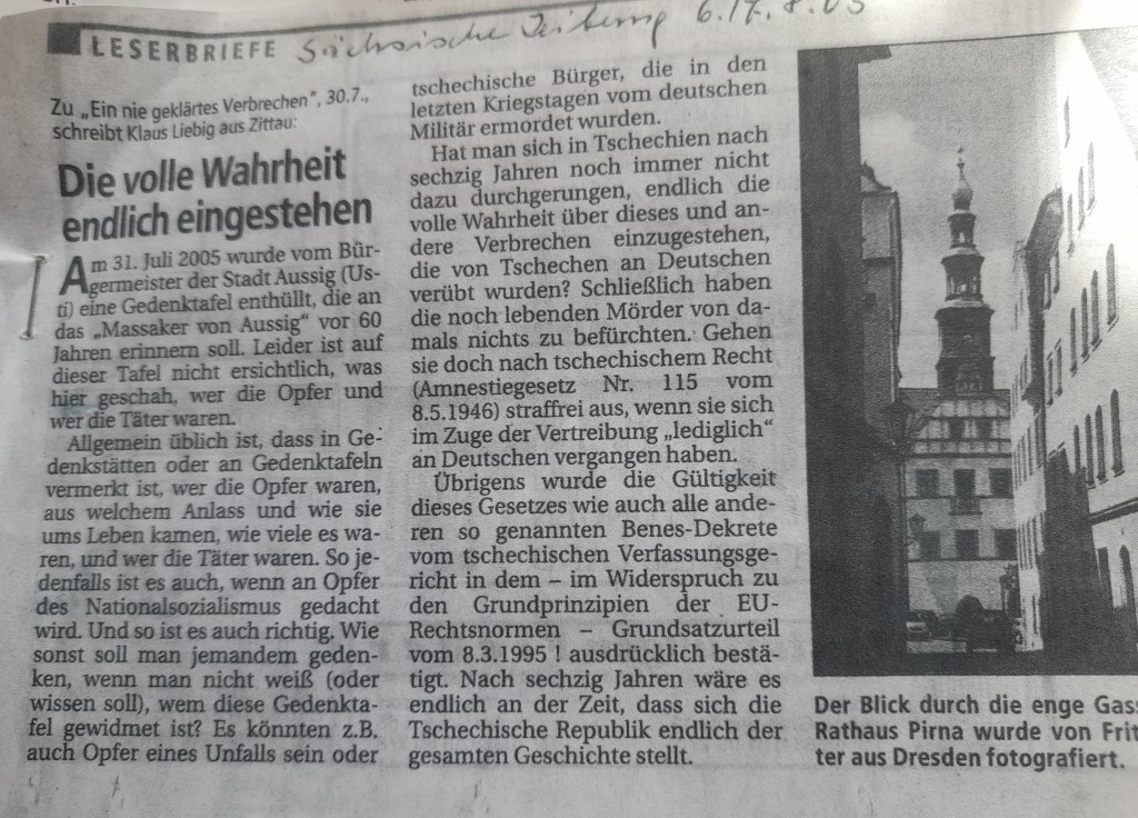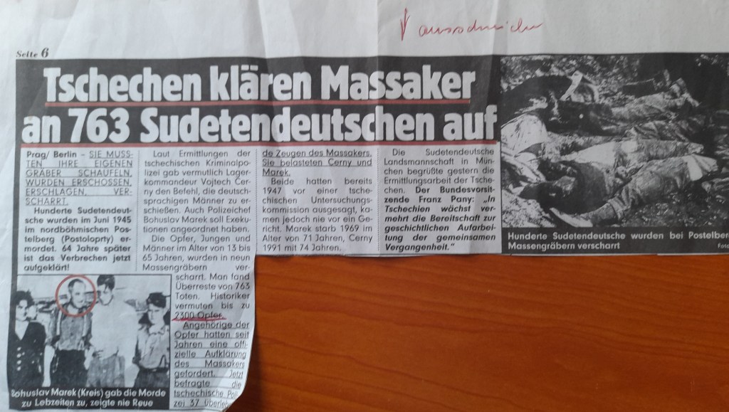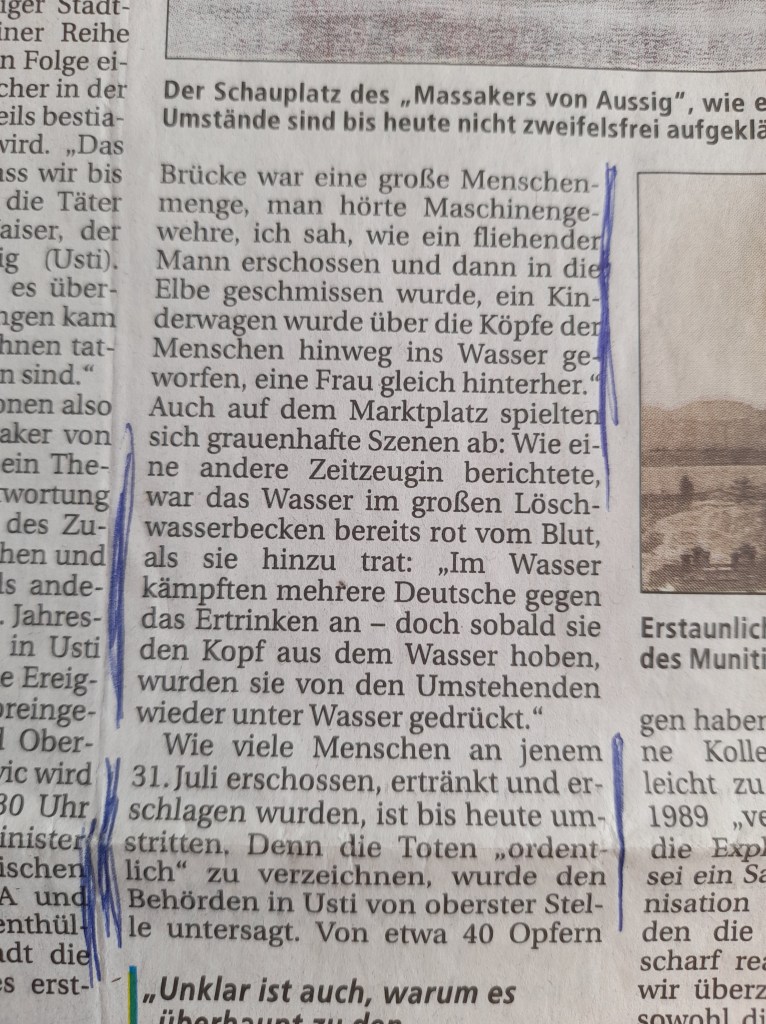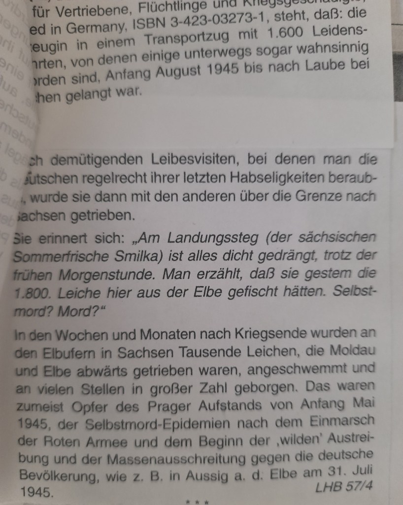 In Bezug auf das Massaker von Aussig, geben allein die Leichen, welche wie Strandgut „angespült“ wurden, Aufschluss. Es sind mehrere Tausend Menschen qualvoll zu Tode gekommen.