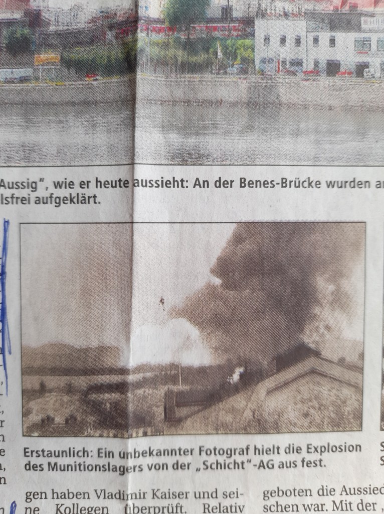 Im Stadtteil Schönpriesen lagerte in einem Depot in der Zuckerfabrik eine große Menge verschiedener Munition, die von der Wehrmacht zurückgelassen worden war. Dort beschäftigte man deutsche Häftlinge aus dem tschechischen Koncentračni Tabor (Konzentrationslager) Ùsti-Všebořice (Aussig-Schöbritz), die an diesem Tag bereits um 14.45 Uhr aus der Zuckerfabrik entfernt wurden.