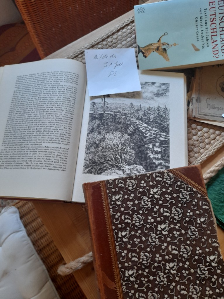 So werfe ich einen Blick zurück ins Elsass und Lothringen als Reichsland zwischen 1871-1918, ein deutsches Land, so urdeutsch in Sprache und Lebensgewohnheiten der Landsleute wie Schwaben oder Bayern, hier wie dort deutsche Dorfhäuser, deutsche Wirtschaften, deutsch die Flachshaare und großen blauen Augen der Kinder, das Spinnrad, das Ehebett, das treuherzige, innige Wesen der Leute, wenn sie erst den Fremden ihr Herz öffneten.