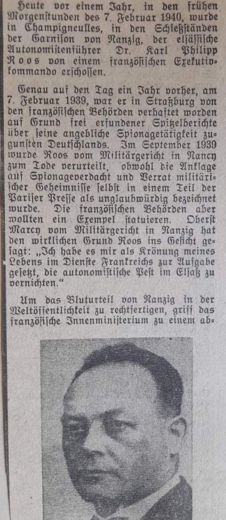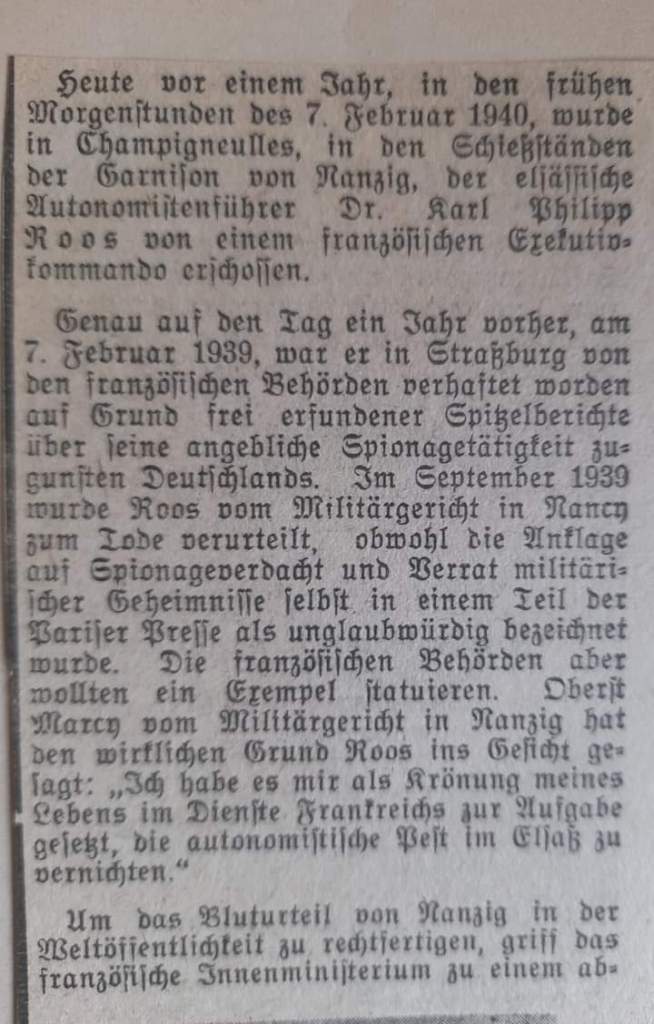 Hier ist es Karl Roos (1878-1940), der sich als Germanist und Heimatrechtler für sein Land Elsass-Lothringen einsetzte und wegen angeblicher Spionagetätigkeit ohne ausreichende Beweise dazu, am 7. Februar 1940 von den Franzosen hingerichtet wurde.
