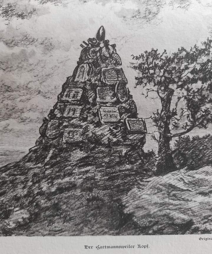Ein Foto zeigt den Hartmansweilerkopf, wo im Jahr 1915 im Ersten Weltkrieg 30 000 Soldaten ( die Zahl vermerkt auf einer Tafel aus dem Jahr 2015) während schwerer Kampfhandlungen zu Tode kamen.
