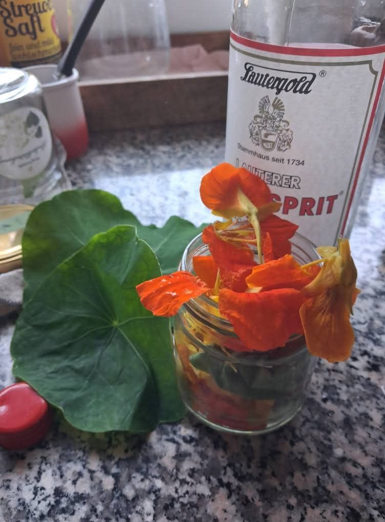 Nebenbei noch ein paar Kapuziner-,Blüten – und Blätter in Alkohol und Öl getränkt, andere zum Garnieren beiseite gelegt.