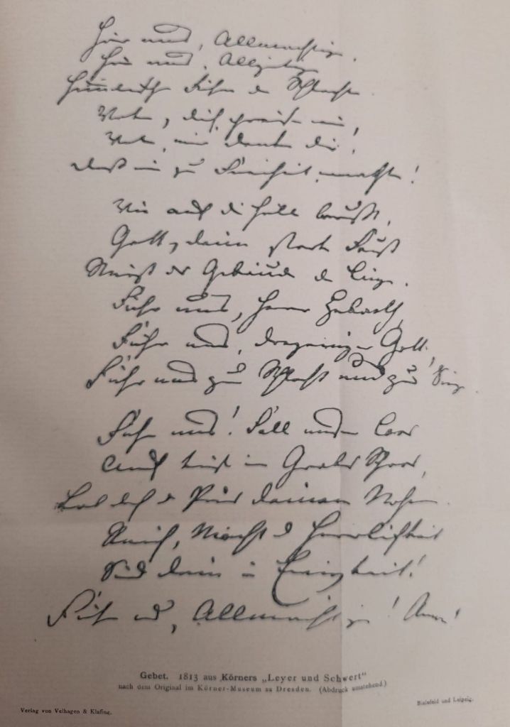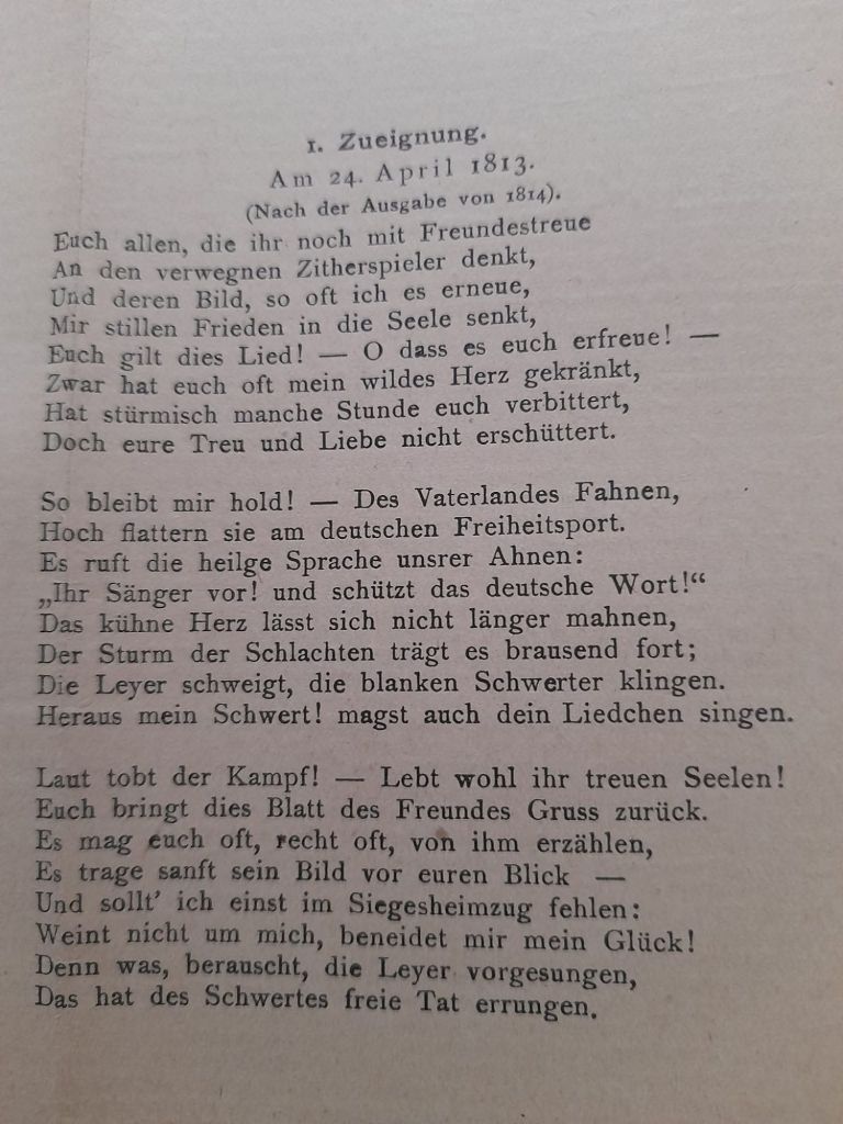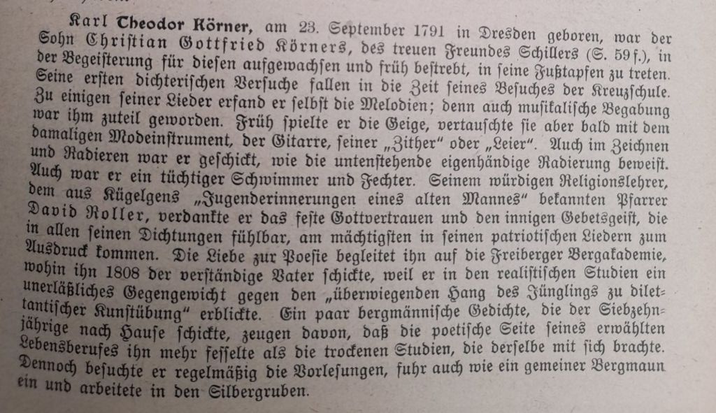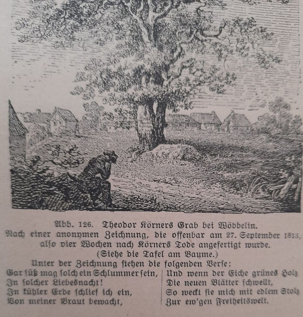 Die kurze Heldenlaufbahn Theodor Körners vom 21. März, wo er bei den Jägern zu Fuß in Zobten eintrat, bis zum 26. August 1813, wo eine feindliche Kugel auf der Straße zwischen Schwerin und Gadebusch ihn mitten ins Herz traf, lebt in seinen Gedichten und Liedern, die sein Vater unter dem Titel „Leyer und Schwert“ Anfang 1914 veröffentlichte, noch heute fort.