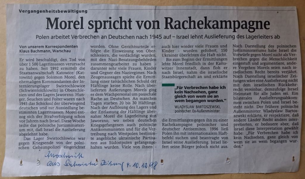 Der Titel: „Morel spricht von Rachekampagne“ – Polen arbeitet Verbrechen an Deutschen nach 1945 auf – Israel lehnt Auslieferung des Lagerleiters ab“