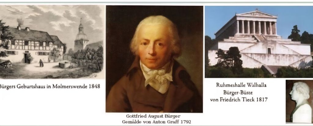 In seinem abgelegenen Heimatdorf im Ostharz hatte Bürger keine Möglichkeit zu geistigem Fortkommen, denn sein Vater, der Pfarrer des Dorfes, kümmerte sich wenig um die Ausbildung. Auf Initative des Großvaters kam Bürger 1760-63 in das Pädagogium in Halle, anschließend bis 1766 auf die dortige Universität zum Theologie-Studium. Sein Interesse an poetischen Versuchen wurde u.a. durch Gleim gefördert. Ab 1768 studierte er Jura in Göttingen, dort lernte er Hölty, Leisewitz, Voß, die Brüder Stolberg und andere Mitglieder des 1772 gegründeten Hainbundes kennen. 1772 wurde er Amtmann in der Gerichtshalterstelle zu Alten-Gleichen mit Sitz in Gelliehausen bei Göttingen. Die Stelle brachte viel Arbeit, finanziell aber wenig ein. Mannigfache Versuche, seinen Sorgen zu entgehen, schlugen fehl: Lotteriespiel, Gründung einer Verlagsanstalt, Auswanderung, Pacht eines Landgutes; ebenso gelang es nicht, eine andere Stelle zu erhalten. Kurz nach der Heirat mit Dorette Leonhardt 1774 verliebte er sich in deren Schwester Auguste, die »Molly« seiner Gedichte. Nach zehn Ehejahren starb Dorette, im folgenden Jahr heiratete Bürger Auguste, diese starb aber schon nach siebenmonatiger Ehe.